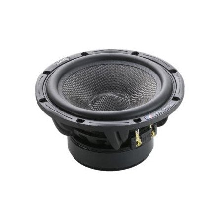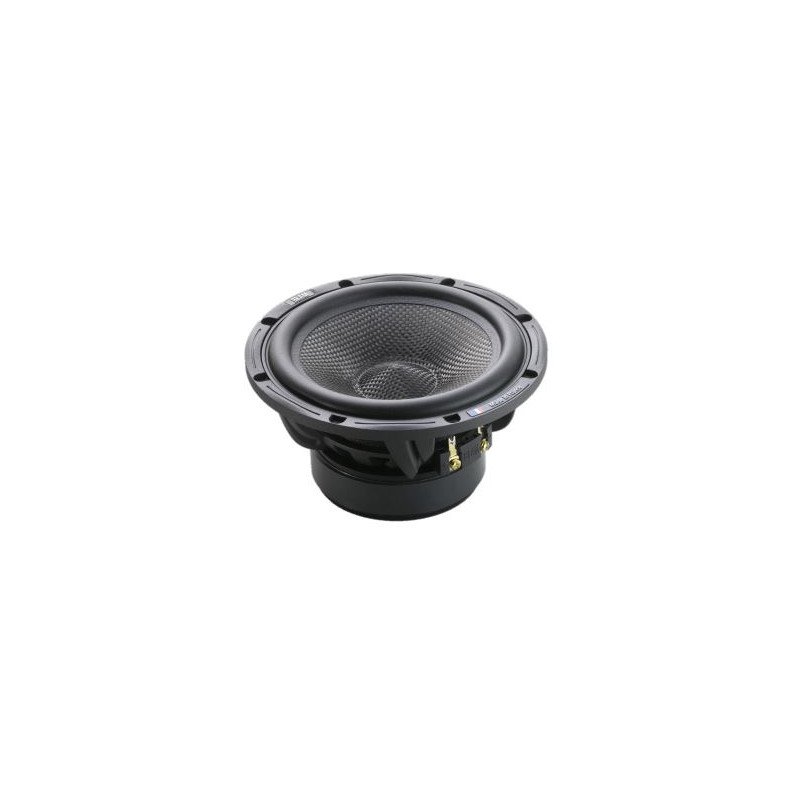 Cesta de aluminio fundido a presión – Cono de fibra de carbono ultra rígido – Suspensión NBR – Araña «conex» de larga duración – Bobina móvil de 38 mm con soporte de fibra de vidrio – Motor magnético sobredimensionado de 100 x 20 mm – Terminales chapados en oro.